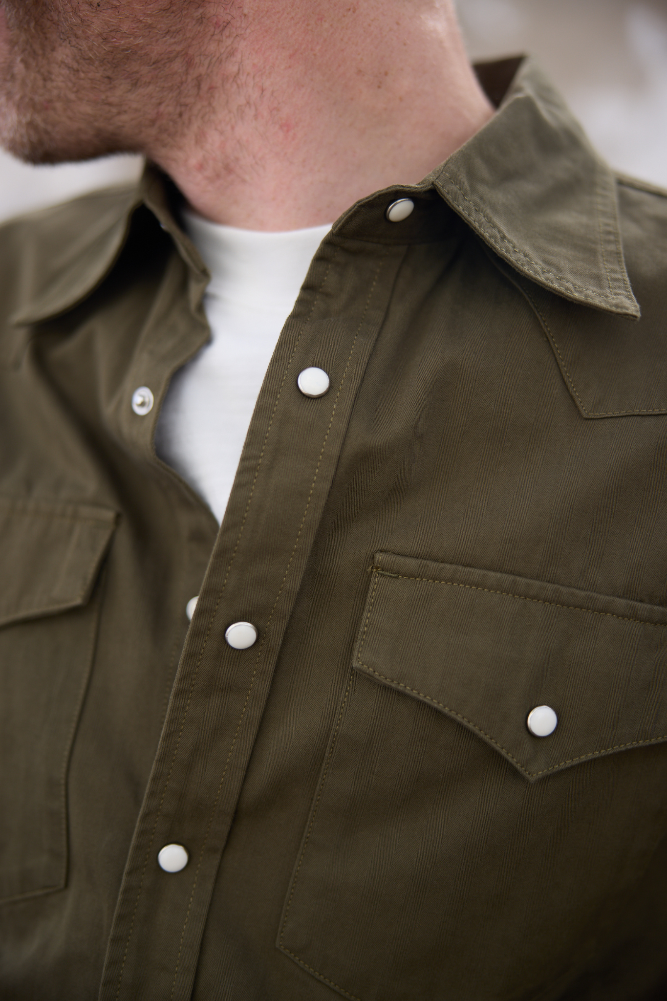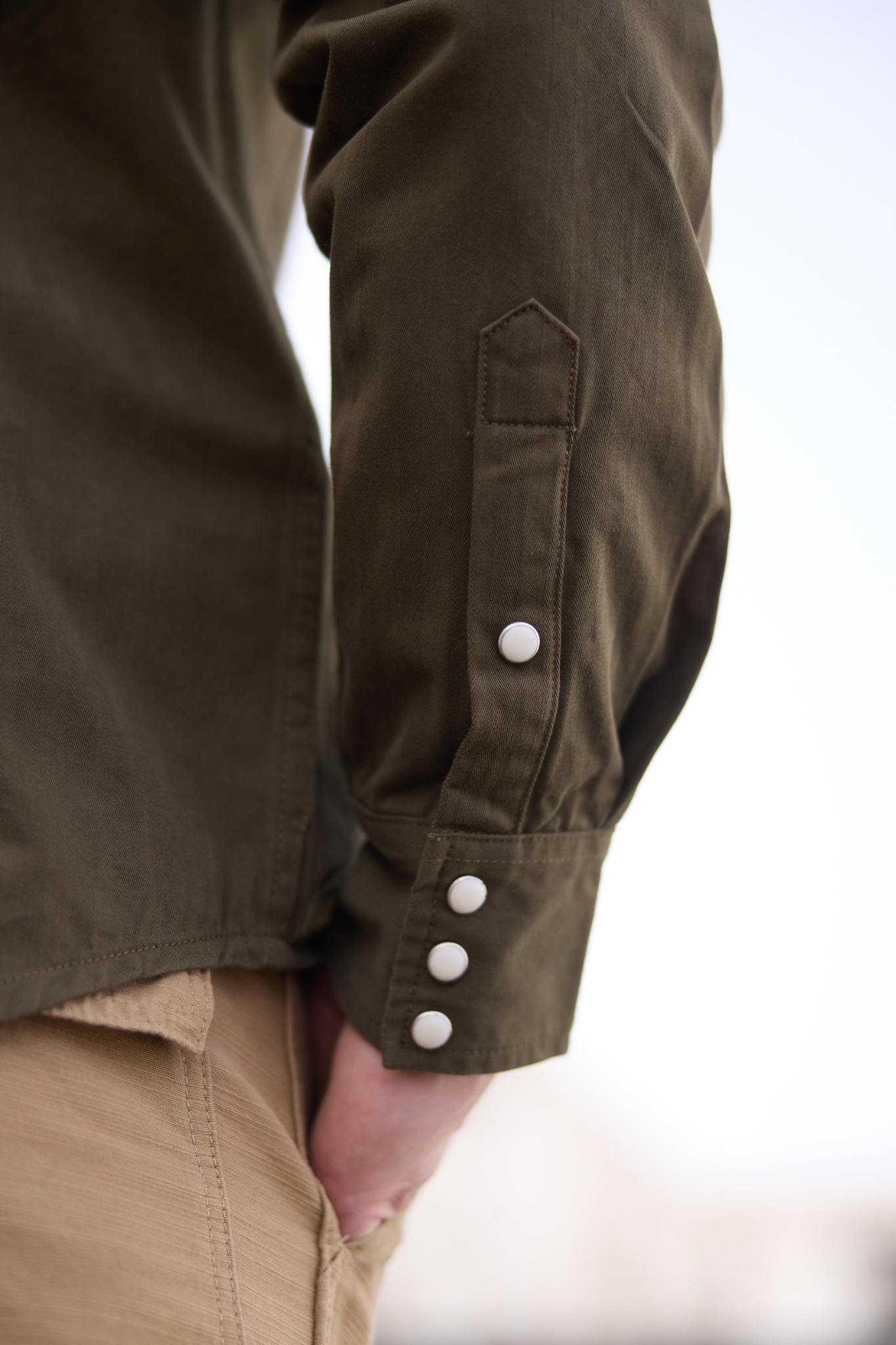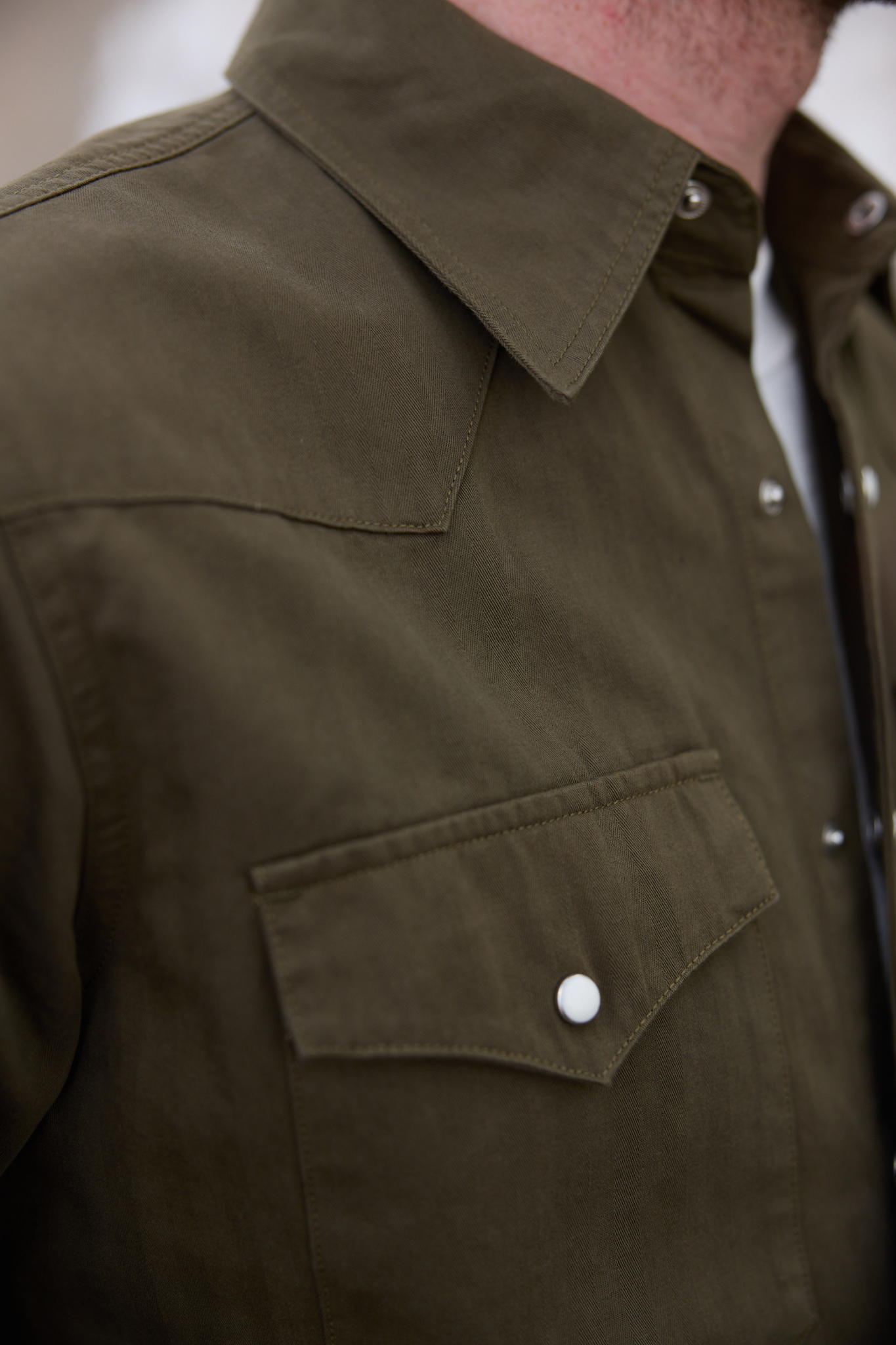 Inspirée des chemises de cow-boy, cette chemise à boutons pressions avec ses empiècements en pointe sur les épaules revisite un classique du vestiaire masculin avec une coupe authentique et un tissu résistant.