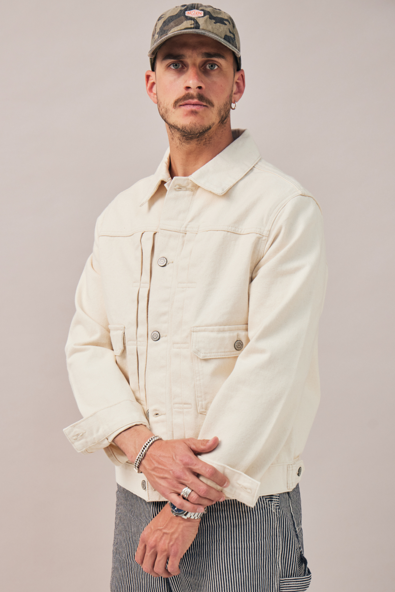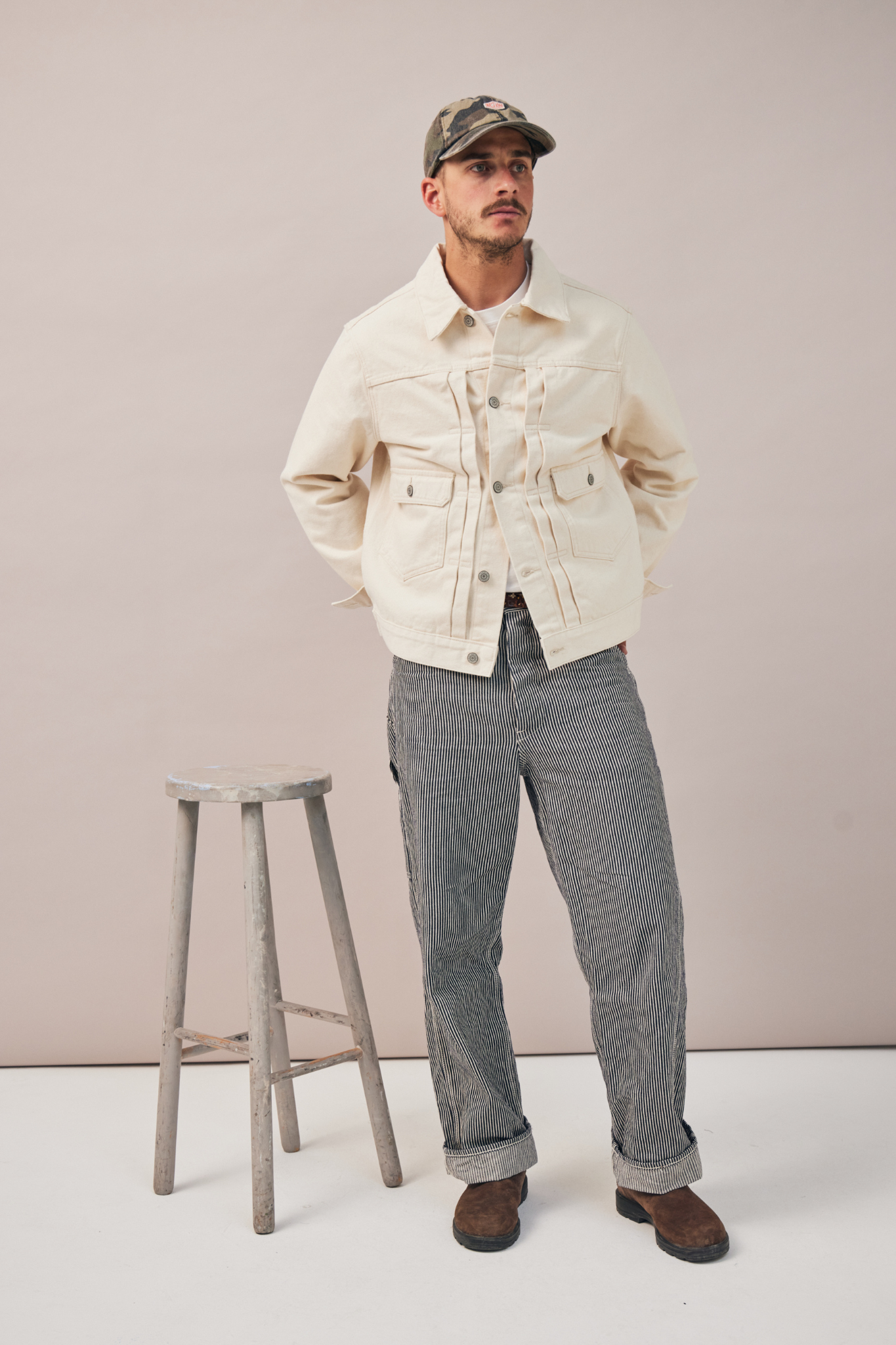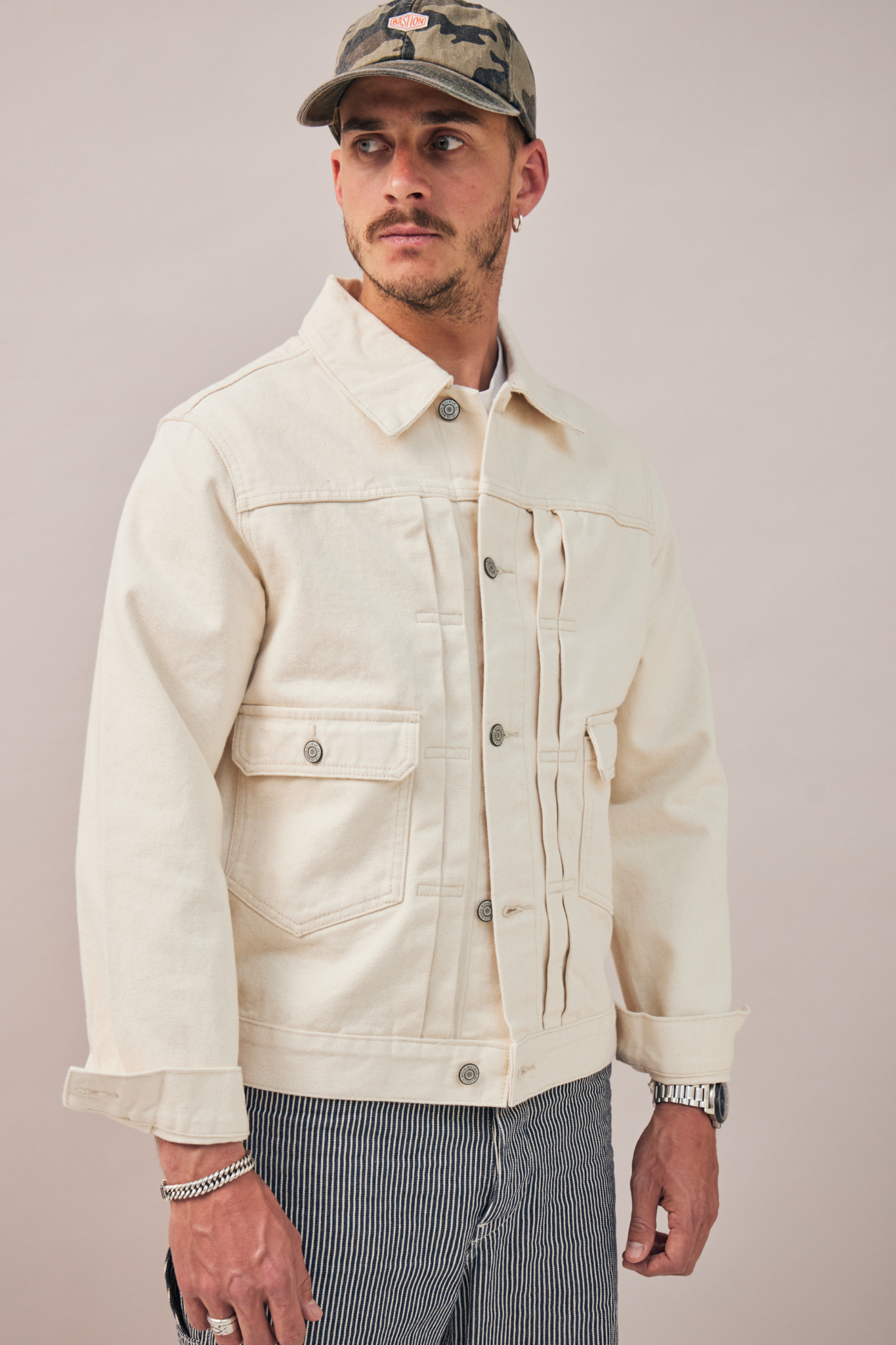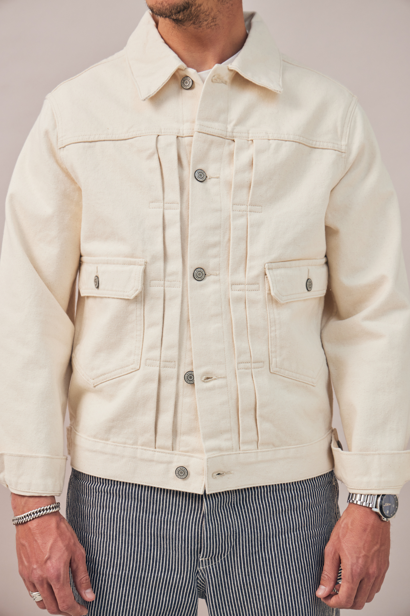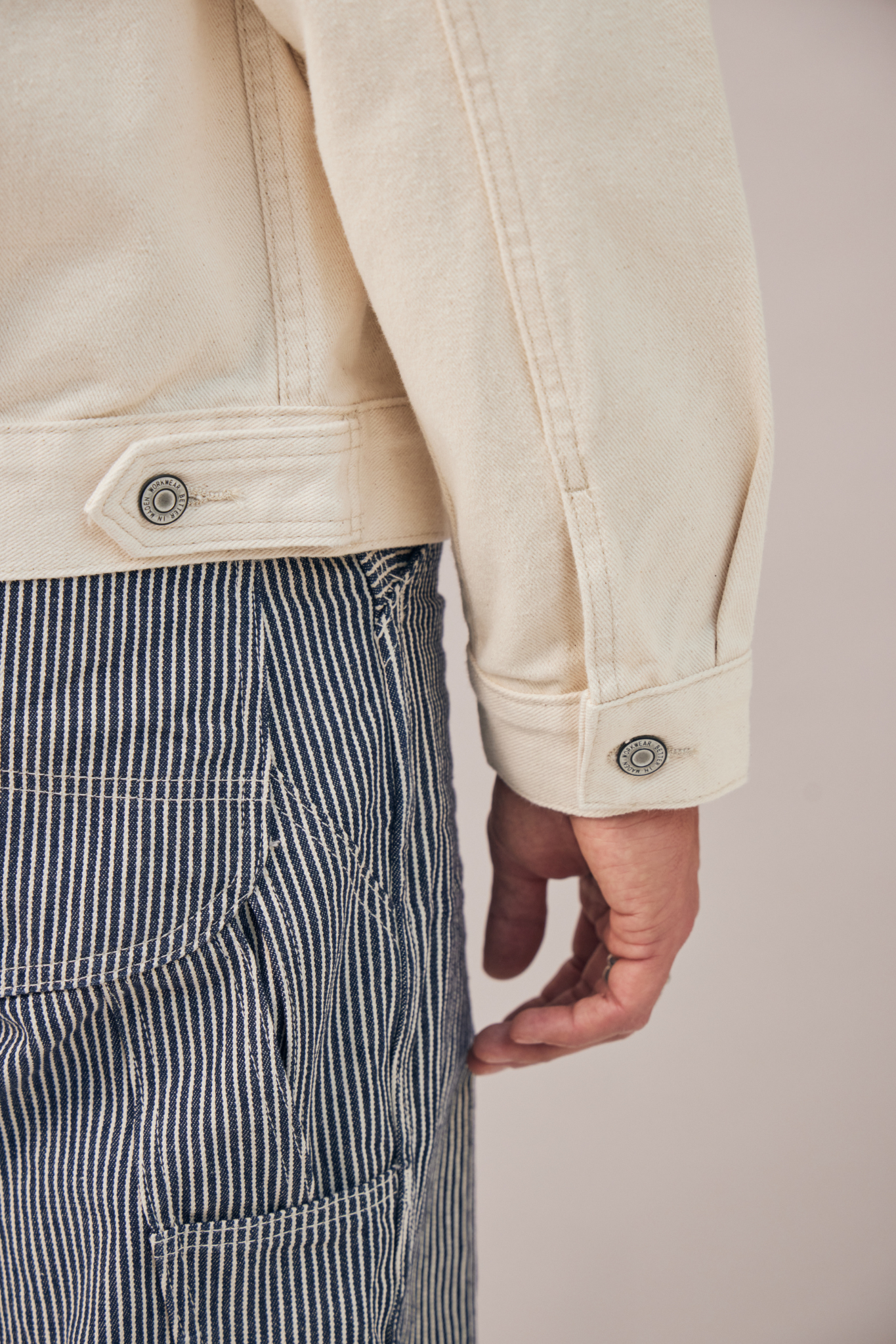 Inspirée de la légendaire veste en jean Type II, Le Sentinelle revisite ce classique du vestiaire ouvrier dans une version épurée et robuste. Taillée dans une toile 100% coton à la main ferme, elle en conserve les codes structurants – coupe courte, double patte verticale et poches à rabat – tout en les adaptant à une silhouette contemporaine. Une pièce utilitaire, équilibrée, faite pour durer.
